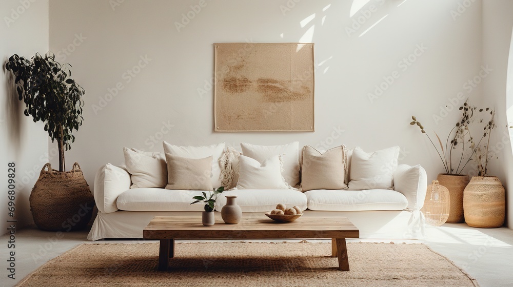 Bright and airy living room with cozy sofa and natural decor in a modern interior space