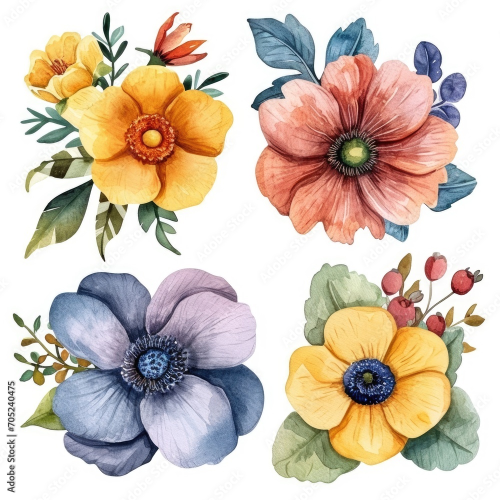 Set Watercolor Flowers Different Types 4 Flowers Four Wallpaper Mural - Decorly Solutions | Decorly Solutions