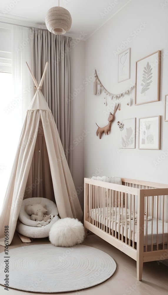 Cozy baby room interior with comfortable crib