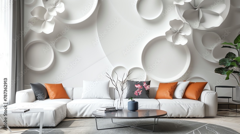 3D wall mural of white flower petals and circles Wallpaper