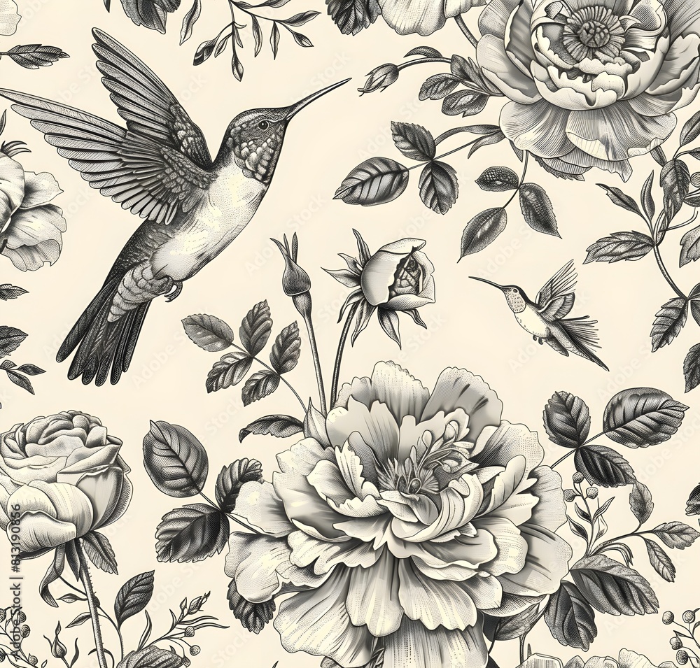 Seamless Pattern Vintage Toile Peonies And Hummingbirds White Wallpaper Mural - Decorly Solutions | Decorly Solutions