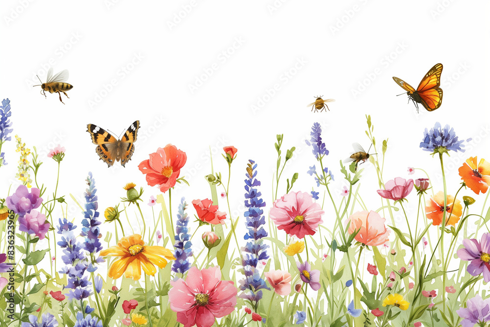 A watercolor illustration of butterflies and wildflowers in a meadow, with a white background