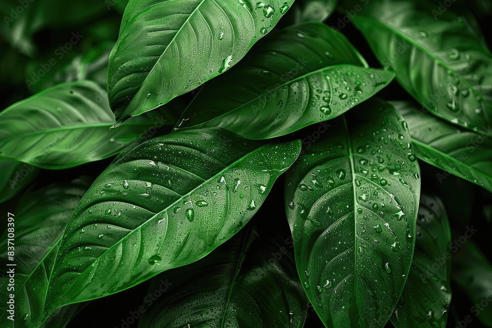 Close-up of vibrant green leaves with water droplets. Nature's beauty captured in a detailed, fresh, and lush natural environment.