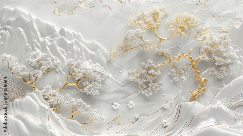 3d Wallpaper With A White Tree And Golden Leaves, A Marble Background With A Landscape.