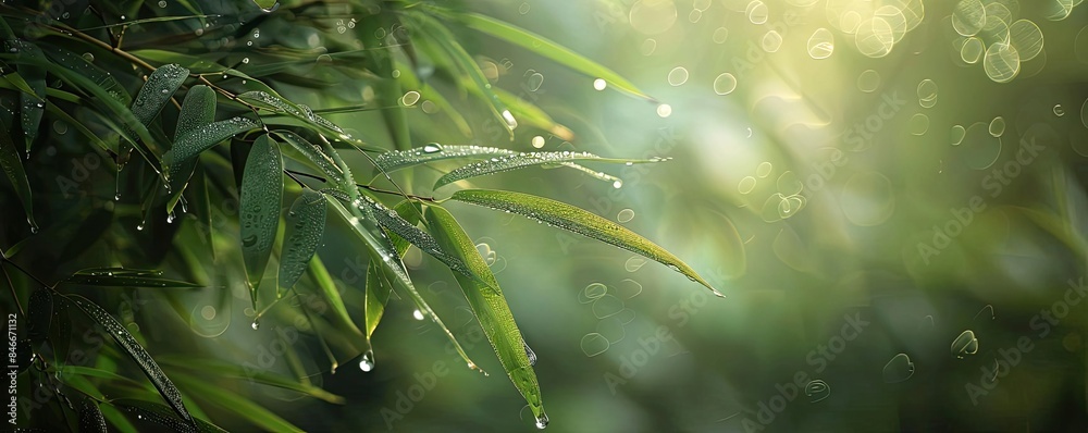 Close-up Of Dewy Green Bamboo Leaves Illuminated By Wallpaper Mural - Decorly Solutions | Decorly Solutions
