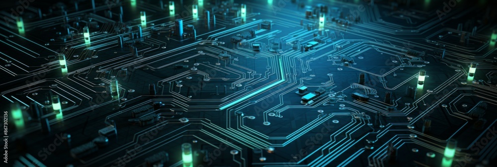 Abstract AI circuit board background. Technology connected blue lines with electronics elements on tech bg. Computer motherboard with a chip, processor, and semiconductor. Digital illustration
