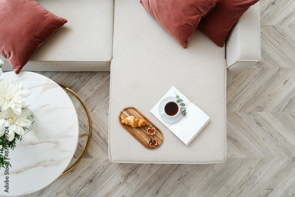 Flat Lay View On Sofa Next To Marble Wallpaper Mural - Decorly Solutions | Decorly Solutions