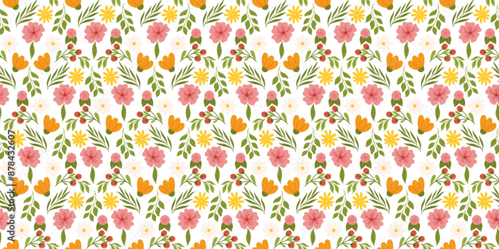 Seamless arrangement featuring floral elements. Botanical-inspired repetitive fabric or wallpaper design with yellow and orange flowers, red berries, leaves, and cherry blossom.