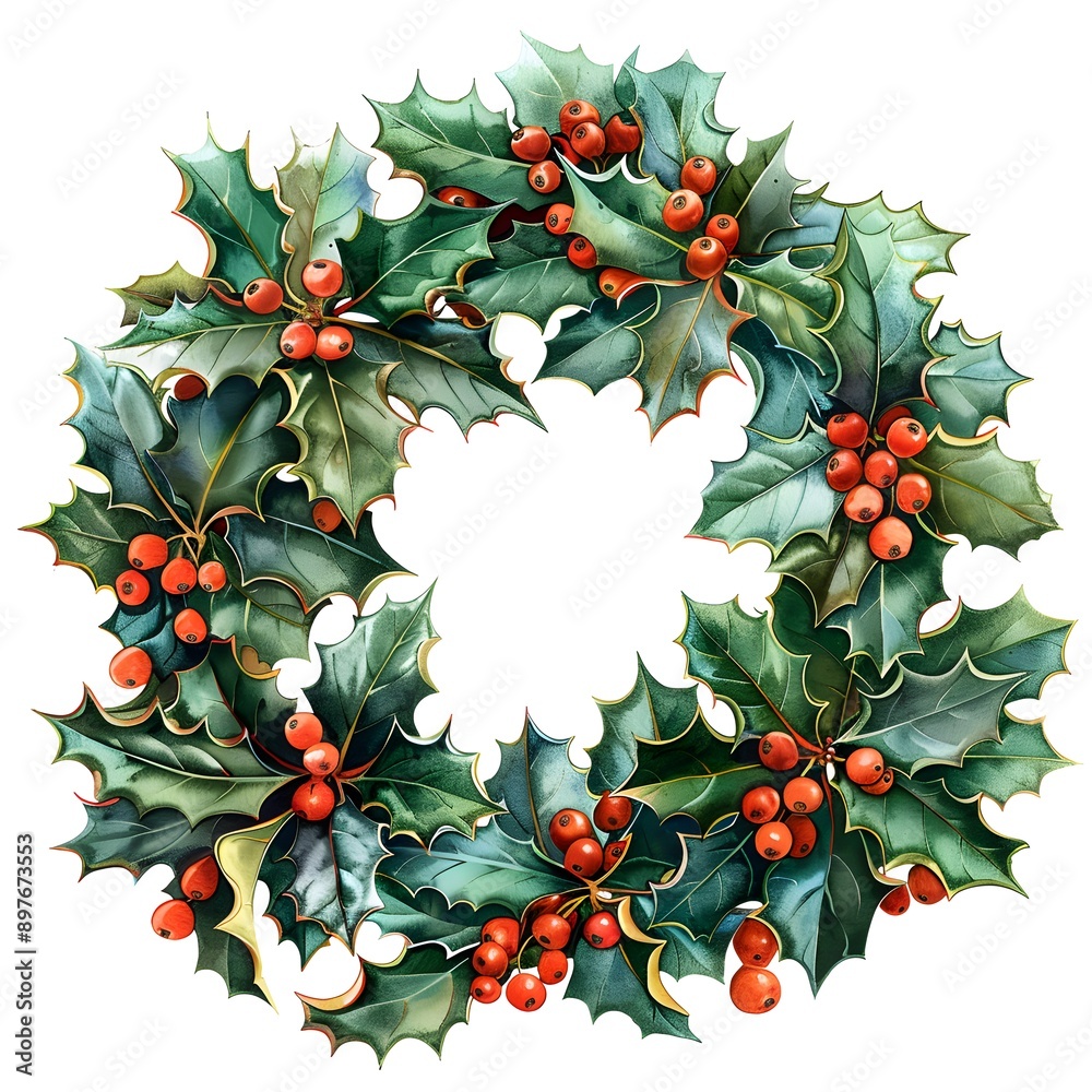 Holly wreath with green leaves and red berries, perfect for winter holiday decorations