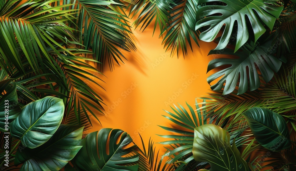 Lush green palm leaves frame a warm yellow background for tropical decor or nature themes
