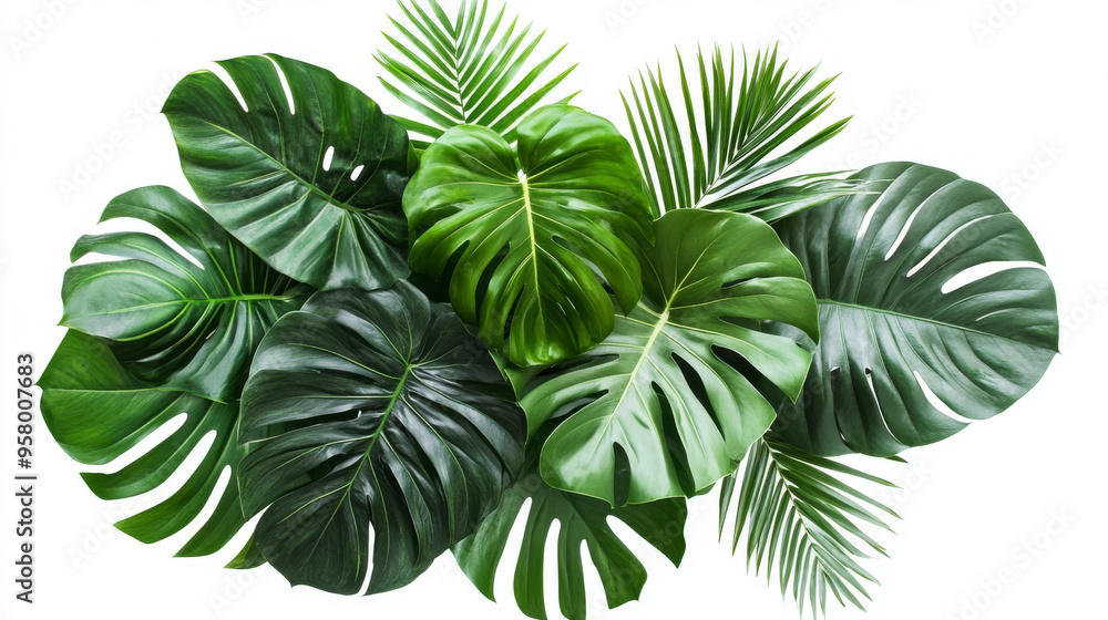 This stunning collection showcases diverse tropical foliage, with lush green leaves and striking palm branches, perfect for design and decoration in various indoor and outdoor settings