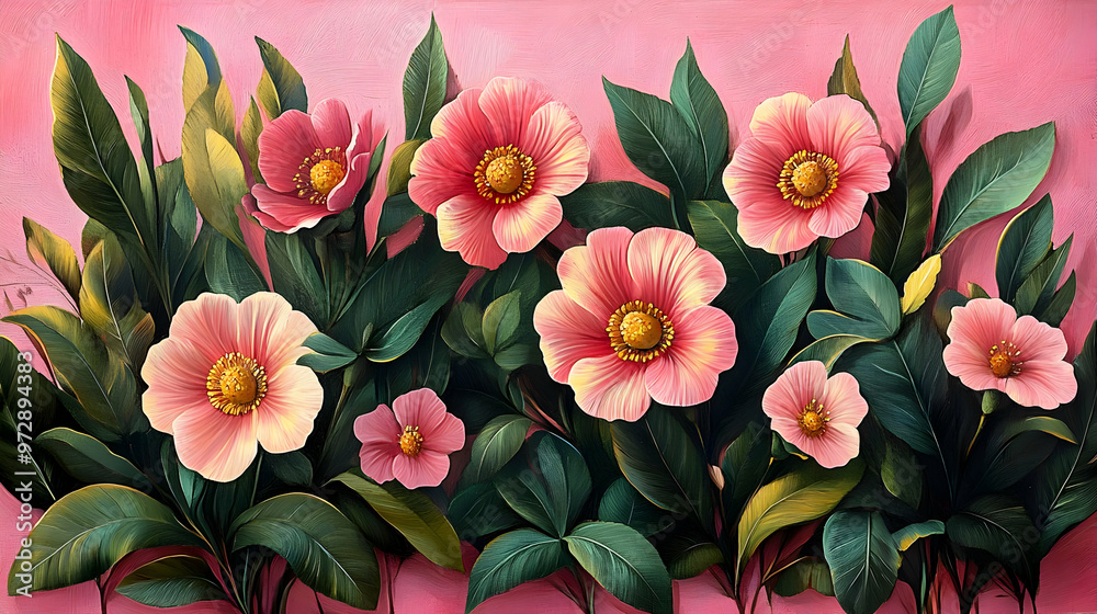 A Vibrant Painting Of Pink Flowers Surrounded By Wallpaper Mural - Decorly Solutions | Decorly Solutions