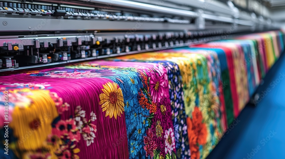 Industrial textile printer creates vibrant floral pattern fabric. Automated machinery in factory setting produces colorful material with precision. Advanced technology in manufacturing workshop,